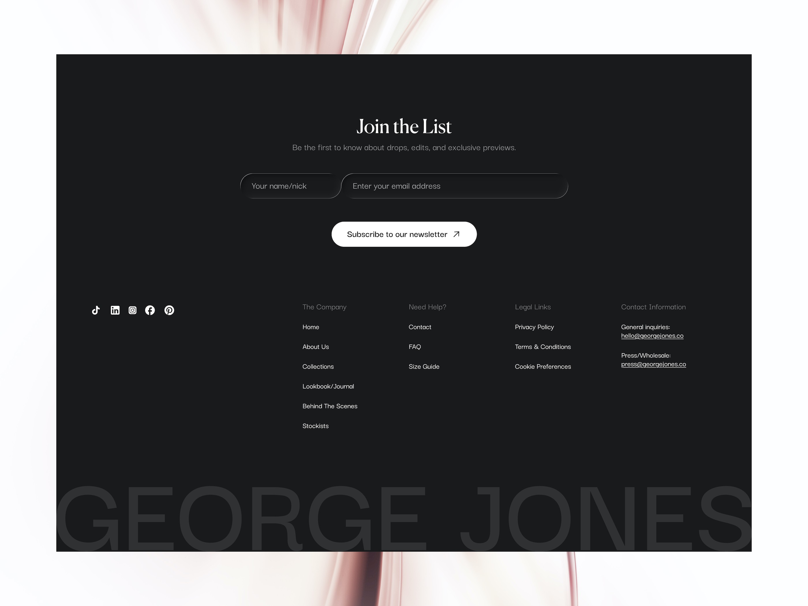 GeorgeJonesisaluxuryfashionbrandbuiltontheprinciplesofminimalism,precision,andpresence. Iledtheend-to-endbrandidentitydesign,creatingacohesivevisualsystemthatpositionsthebrandasrefined,modern,andgloballyrelevant.